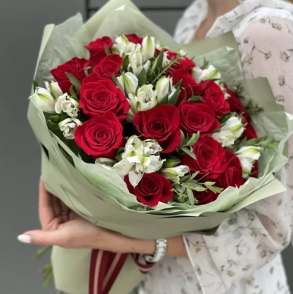 Чудесный букет из альстромерий и роз в стильной упаковке